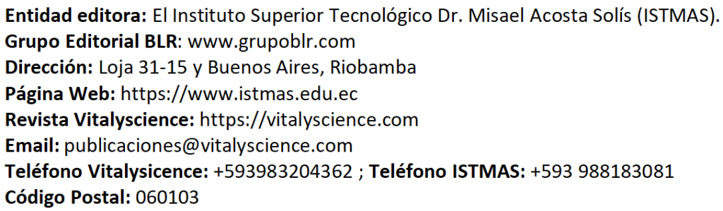 Publicamos artículos originales como también artículos de revisión. Nuestra institución editora es el Instituto Universitario Misael Acosta Solis (ISTMAS), con apartado postal: 60103 nuestro contacto de correo electrónico es: publicaciones@vitalyscience.com Todos los manuscritos enviados a VitalyScience pasan por un riguroso proceso de revisión por pares. Los revisores, especialistas en las disciplinas correspondientes, evalúan la calidad científica, la originalidad y la relevancia del trabajo, asegurando altos estándares editoriales. Las revisiones son anónimas para garantizar la imparcialidad.