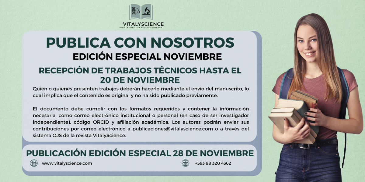 La Revista Multidisciplinaria VitalyScience tiene como propósito principal ser un referente en la promoción y difusión del conocimiento científico y académico de vanguardia, fomentando un espacio plural y colaborativo para la publicación de investigaciones innovadoras y transformadoras. A través de un riguroso proceso editorial y un enfoque en la accesibilidad, busca enriquecer el desarrollo de múltiples disciplinas, facilitando el diálogo interdisciplinario y el intercambio de ideas entre las comunidades científicas a nivel global. Comprometida con la excelencia y la equidad, VitalyScience aspira a democratizar el acceso al conocimiento, garantizando que cada contribución publicada impulse el avance intelectual y genere un impacto tangible en la sociedad y en la solución de los desafíos globales contemporáneos.